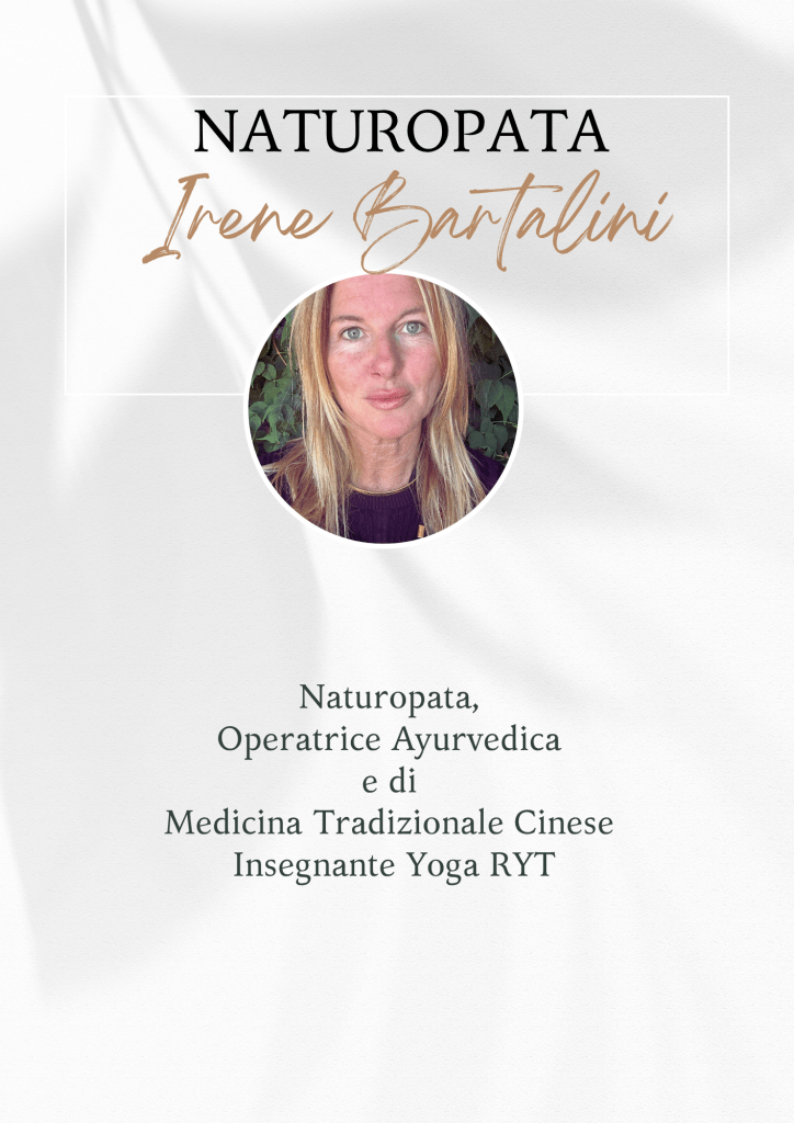 Mi chiamo Irene Bartalini, svolgo l’attività di Naturopata e insegnante Yoga certificata (500hrs RYT). Pratico varie discipline come Hatha, Ashtanga, Yin Yoga, Hormonal e Chair Yoga, Yoga per bambini. Nei percorsi che costruisco insieme ai miei clienti in base alle loro esigenze, rivediamo le abitudini quotidiane dall’alimentazione, al sonno, all’attività fisica ponendo grande attenzione al respiro e al linguaggio del corpo, attraverso l’adozione di tecniche di Medicina Tradizionale Cinese e Medicina Ayurvedica. Mi puoi contattare qui per approfondire, puoi venire in studio a trovarmi oppure seguimi sui social per restare aggiornato sugli eventi e i Retreats che conduco sparsi qua e là.